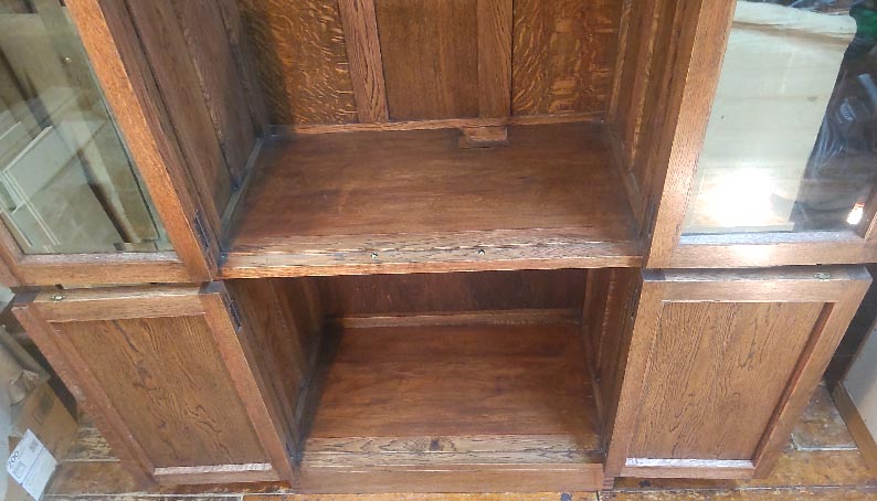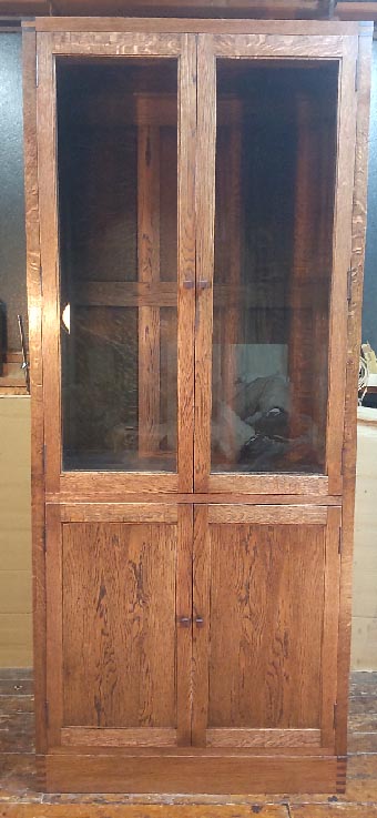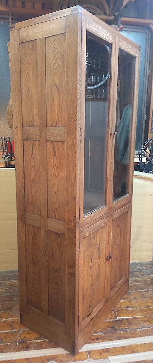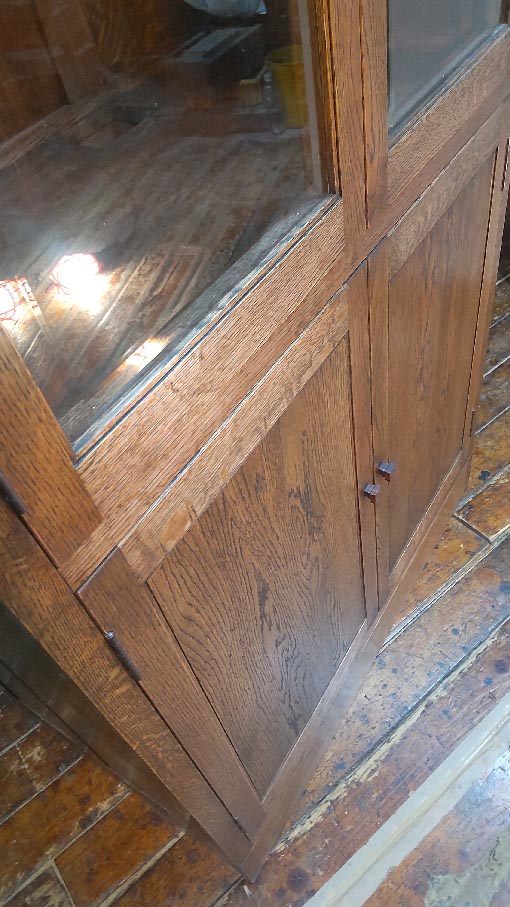 世の中にはいろんな用途のの機器があるようでしてマニアの間では常識らしいのですが定期的にレコード盤の洗浄ということをするらしくそれを自動化した機械も販売されているようです。ご注文主の方もそうした趣味をお持ちで前のタイプのものは床置きで注排水に少し手が掛かる不満があったようで今回趣味に特化した別邸を作るにあたり壁一面に設えた棚の中に収めて見栄えを良くしたいと思い立ったそうです。 材はナラ。キャビネット内部で水を使う作業をするということで板の動きが気になりますのであまり見えなくなる天井や床の板には影響の少ない合板を、回りを囲む羽目板も柱を増やして一枚の動きがなるべく小さな範囲のものになるよう図面を書きました。 上台には洗浄機本体、下台には水を貯めるタンクが収まります。それをホースで繋ぐため上段の地板にはそれを通す穴をあけています。全部自動化するので下台の下、床から給排水各1本づつホースが立ち上がってきてタンクに繋げるのですが現場工事がそこまで進んでいないので位置が分からないためその穴と電源のコード穴は後日改めて空けることになります。  |