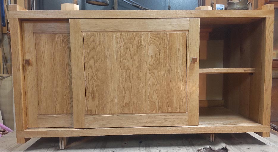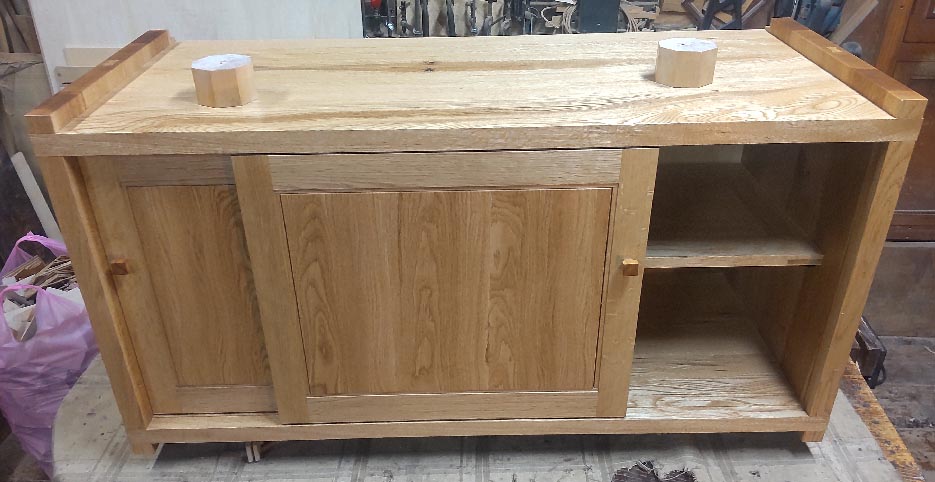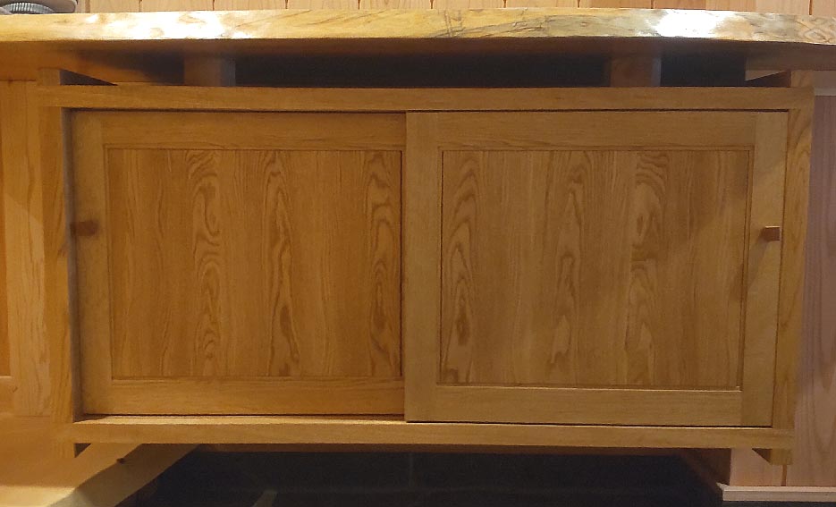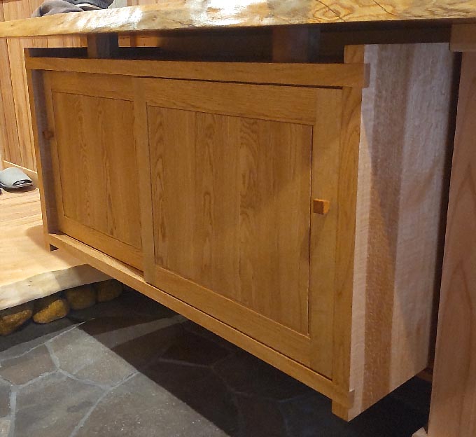 これも昨年から続いているお得意様物件の一つ、玄関に置かれる下駄箱です。設置場所は三和土から上がり框にまたがるところで上には腰高に長い一枚板の棚が(こちらは大工さんの仕事)壁に埋め込まれていてその空間に上は4cm、下は20cm隙間を開けて本体を吊って欲しいとのご希望でした。背板を壁に何か所かビス止めすれば固定できるのではないかとのお話ですが合板を使った中空のフラッシュものならともかく無垢の欠点とも言えるかもしれませんが重いです。それに壁がスギの腰板ですから接着剤をベタ塗りしても仮に留まったところで直に落ちてしまうだろうと思います。結局妥協してもらって甲板上に2点だけ柱を立てさせてもらってそれを通して長ビスで本体と上の棚を固定するという方法を採らせていただきました。上に載っているメープルの八角材がその柱です。 材は主にミズナラ、普通のナラの中では目が詰まって軽い方です。帆立はご希望があって30oの板ですが軽量化のために甲板・地板・棚板は14ミリの薄板を組み合わせて使っています。ただ普通の据え置きと違って吊り式の場合甲板など常に上向きに引っ張られている状態になるため強度確保のため板幅を増やしホゾやホゾ穴も緩みが出ないよういろいろ工夫して手は描けてあります。 |